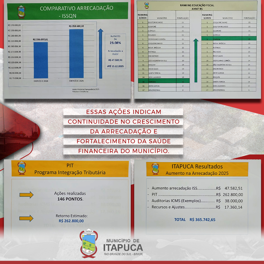 Em 2025, Itapuca registrou um aumento total de arrecadação de R$ 365.742,65, resultado da soma de diferentes frentes de trabalho: