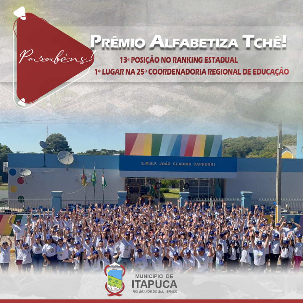 A Administração Municipal de Itapuca, por meio da Secretaria Municipal de Educação, parabeniza a Escola Municipal de Ensino Fundamental João Claudir Caproski pela expressiva conquista no Prêmio Alfabetiza Tchê, promovido pela Secretaria de Estado da Educação do Rio Grande do Sul.